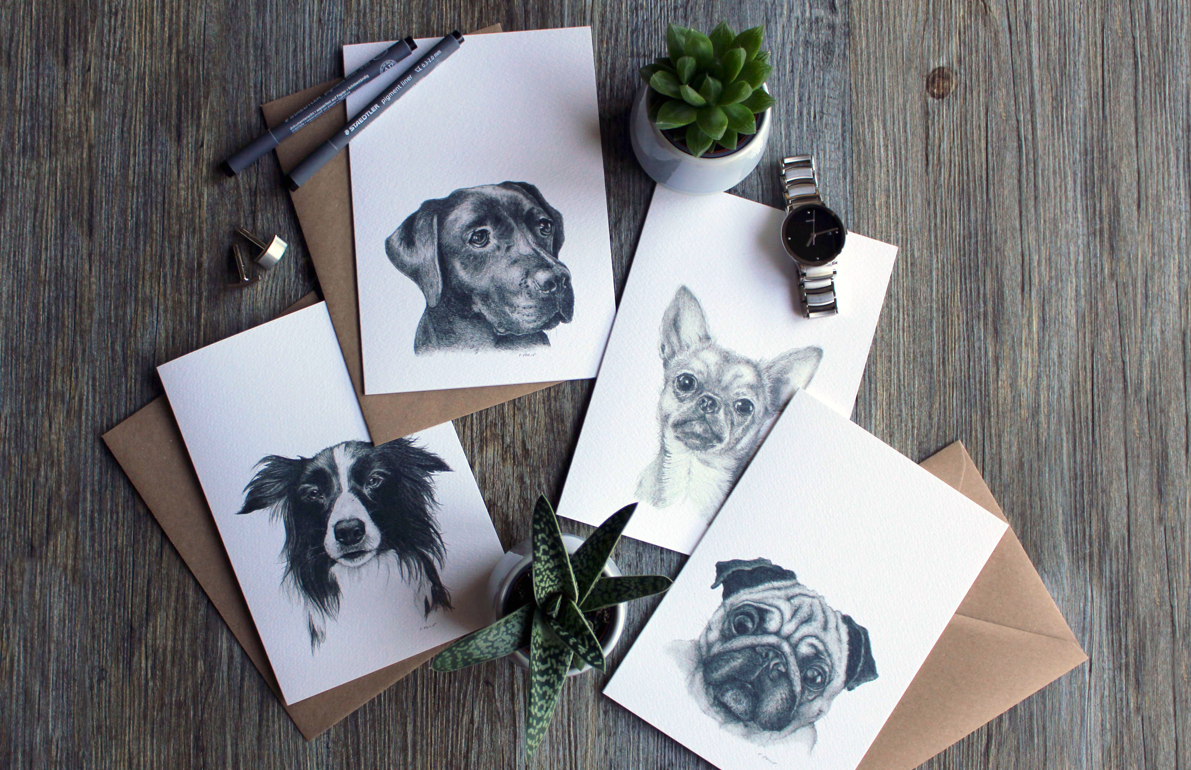 “As you can probably tell I am a bit of an animal lover – especially dogs! I offer pet portraits and commissions which have quite a realistic style and my aim is to have not only a physical likeness but to also capture the character of their pet. I like to change things up a bit with my greetings cards and make them a little more playful and really try to being out the expressions and character with a more illustrative style!”
