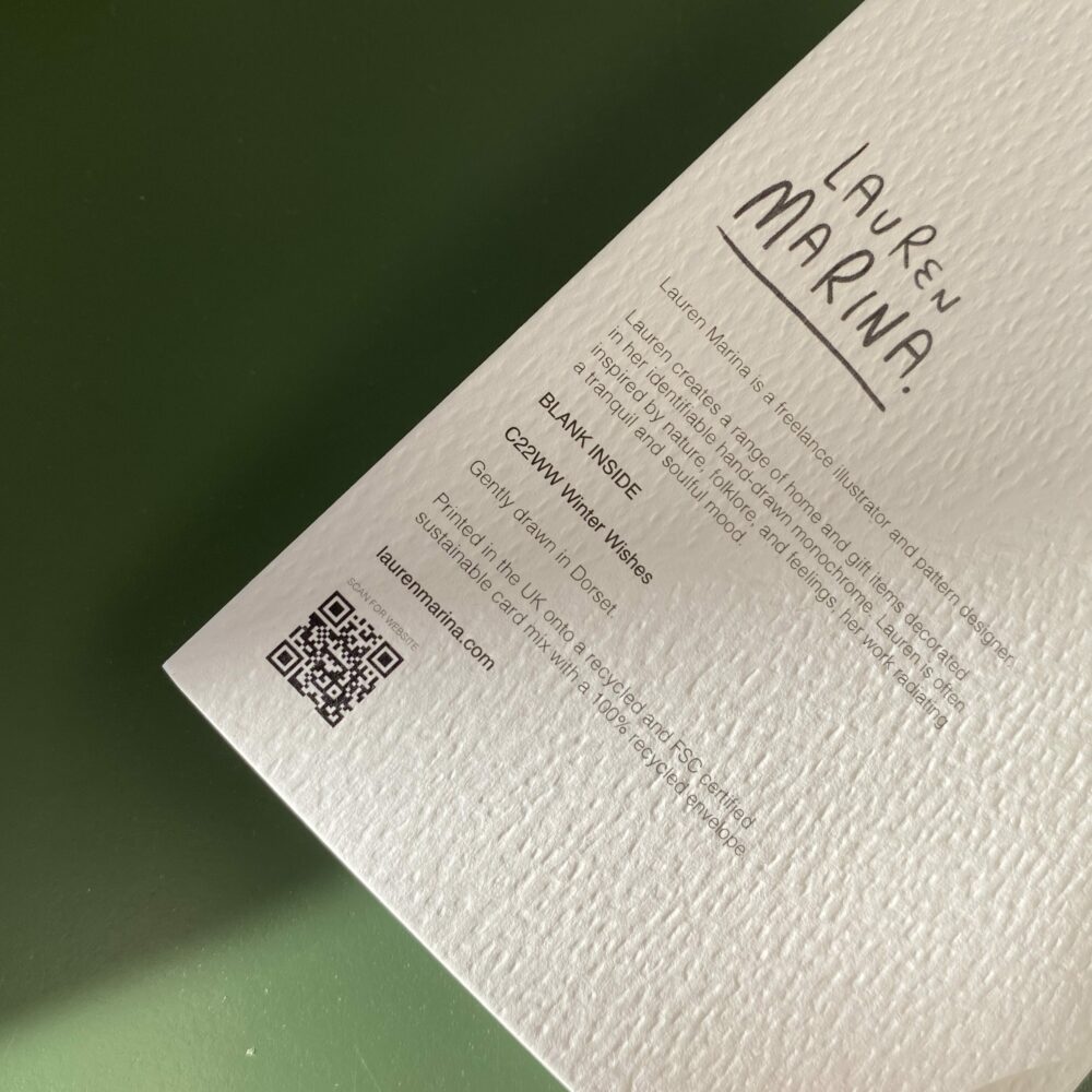 Aside from finishes and colour schemes – we’ve got an alternative trend to call out for 2023. QR codes are popping up across all types of stationery, including Business Cards, Postcards and Flyers. We’ve seen a big uptake for this approach on Greeting Cards too, with customers such as Lauren Marina incorporating these little squares onto the back of her cards.