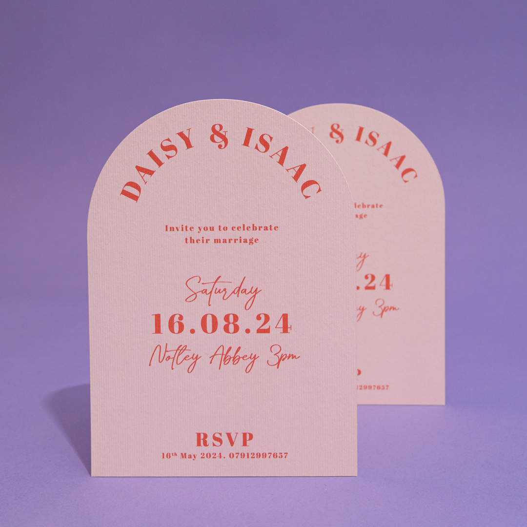 With our new VeloBlade, you can let your imagination run wild, especially when it comes to custom shapes. Recently we’ve seen a stunning trend for arch-shaped Wedding suites, something that with our new machine is really easy to achieve. The above Wedding Invite is printed on our Aquerello paper stock, which gives a beautiful finish with this colour palette.