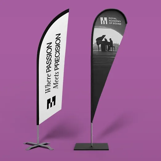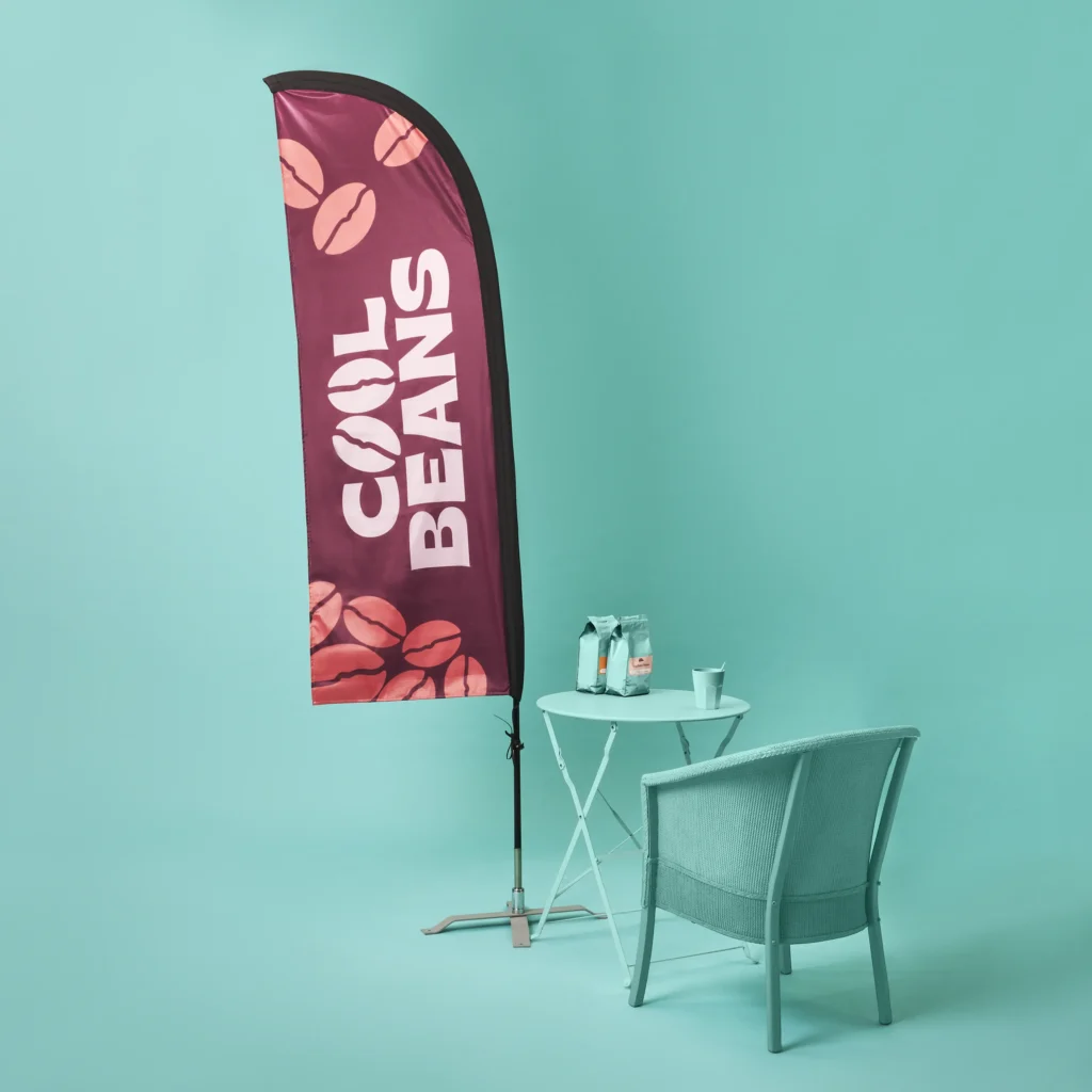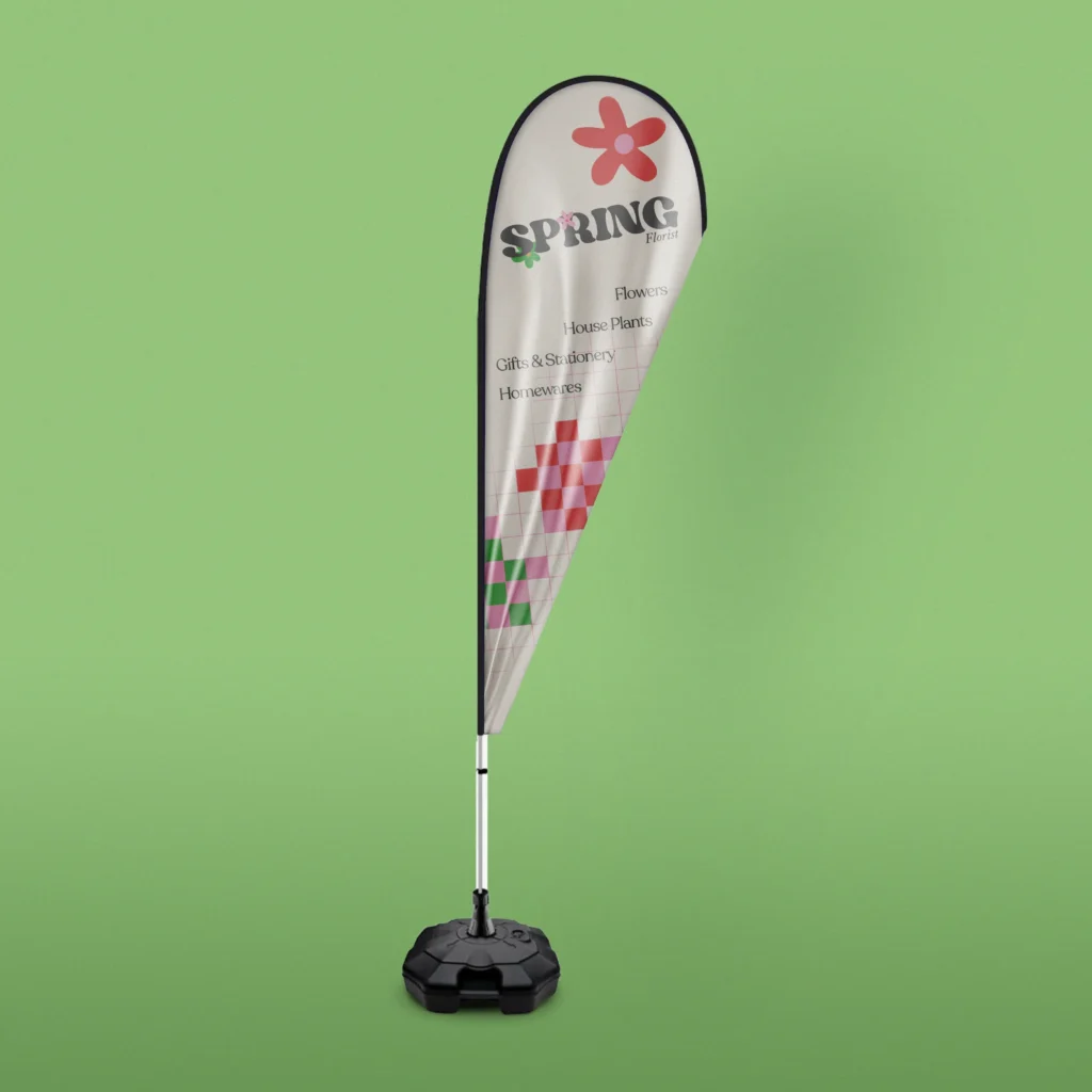 Teardrop flags have a more rounded shape which makes them great at catching attention at events, exhibitions and in your retail space, outdoors or in. Available in single or double sided, in three sizes – 2m, 3m and 4m, with a choice of bases for all environments, Teardrop Flags come with a handy carry case as well!