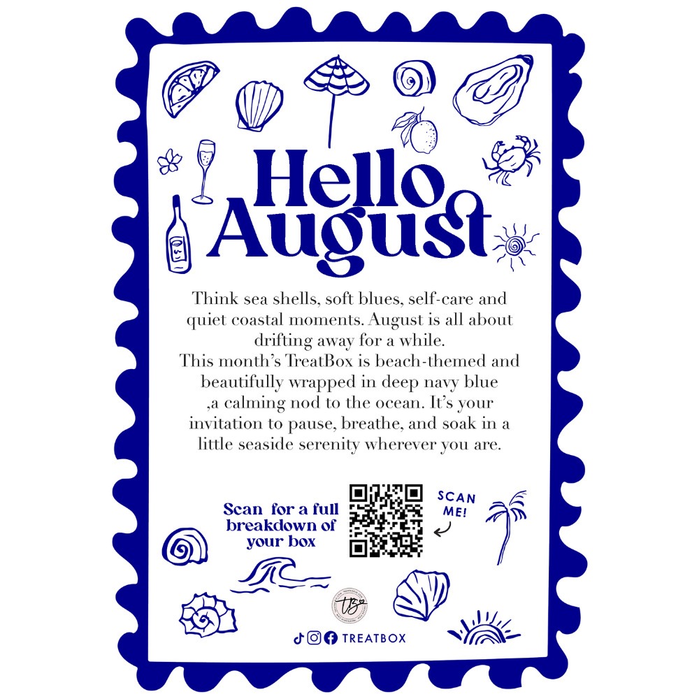 Created a A5 Flyer to showcase their August beach themed treat box, featuring a QR code to the full breakdown of the box’s content. In beautiful whites and ocean blues with beach themes illustrations, and printed in our silk paper stock for a smooth and soft touch.