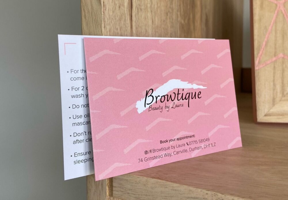 Neat, pink and clean- this is an aftercare card you’ll be proud to stick on the fridge. Created by What Sarah Designs for Browtique, we love the subtle repeated eyebrow pattern. Think your hospitality print deserves an upgrade? Pink might be the way to go…