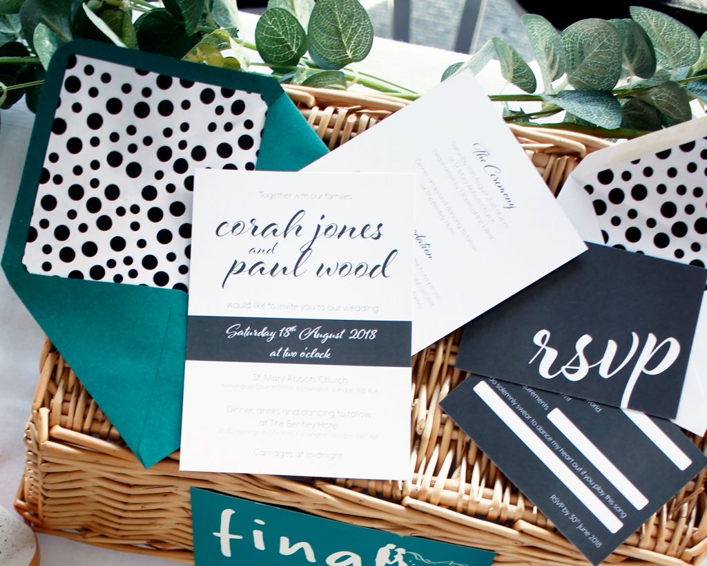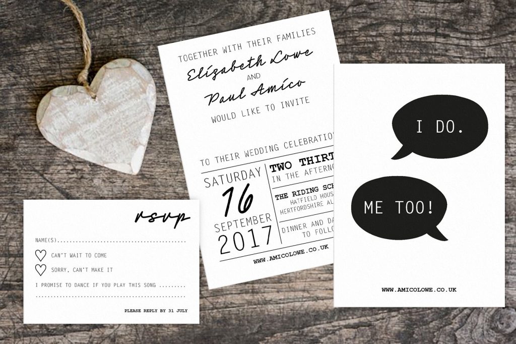 We love Francesca Norton Wedding Stationery‘s modern take on her Save the Date, Invite and RSVP above. In simple black and white, with a mix of contrasting, yet complimentary fonts and styles, it makes the perfect choice for a modern and fun wedding.