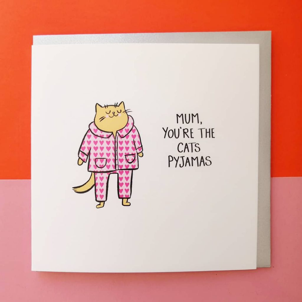 Is your Mum the cat’s pyjamas? Tell her that with these cards by Rosie Fairholm. We love this Brighton based illustrator and plush toy maker’s style. She’s a self-confessed cute animal, cat and chocolate lover – alongside designing and selling on Etsy she even works part-time in a chocolate shop called Choccywoccydoodah! We think she’s living the dream!