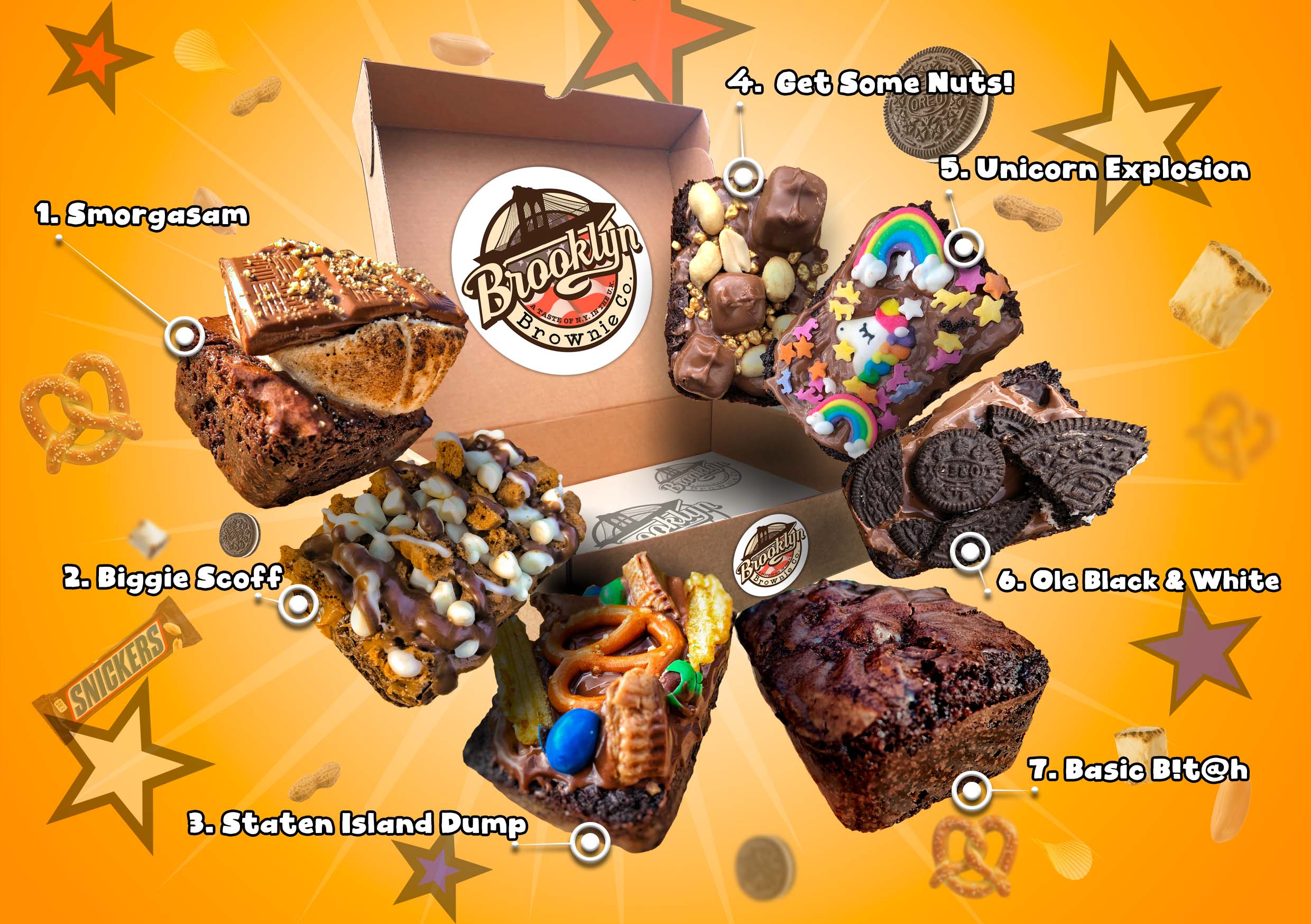 Our wild lineup of Brooklyn brownies all come from a father and son joking around in the kitchen. We try our hardest not to take things like names of brownies seriously. Our products are fun, over the top and tasty so we just think the names should match.