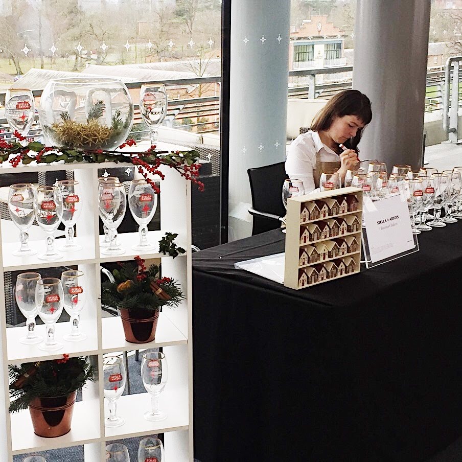 That must have boosted my website traffic or something, because enquiries started coming in. While I was studying at Edinburgh College of Art I had my first ‘proper’ enquiry. It was a posh handbag shop in Gateshead. I drove down for a trial, but they gave the job to somebody else in the end! That first experience taught me to ask for a table and a chair, and to take my time. I know that to work well I need to be comfortable, and I also learned that it’s really helpful to have a member of staff nearby. This is especially true if you’re live illustrating in a store and there’s a special offer on or something – while illustrating for House of Fraser I was really grateful to have staff nearby to answer customers’ questions so that I could keep on drawing. Later on in 2017 I was contacted by Stella Artois and have done quite a few events for them, drawing city skylines and landmarks onto their branded chalices at different events all over the UK.