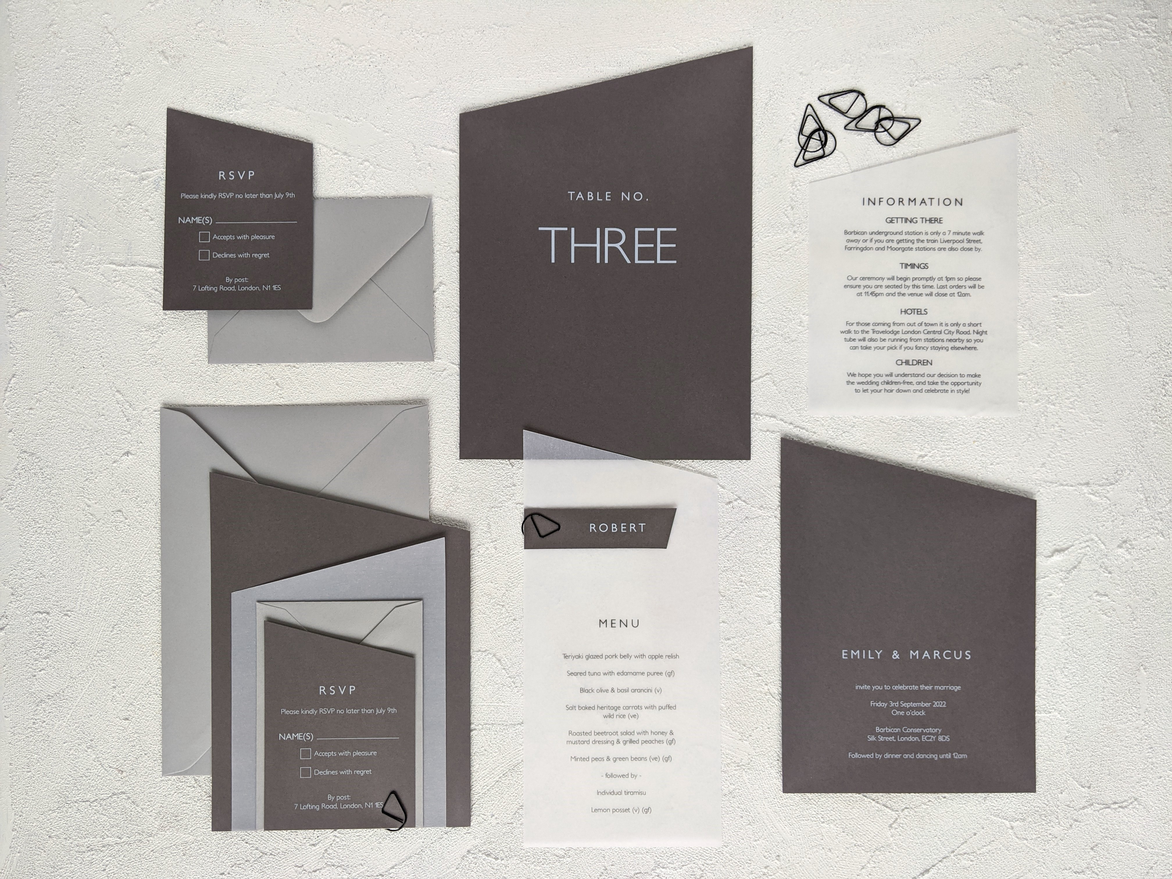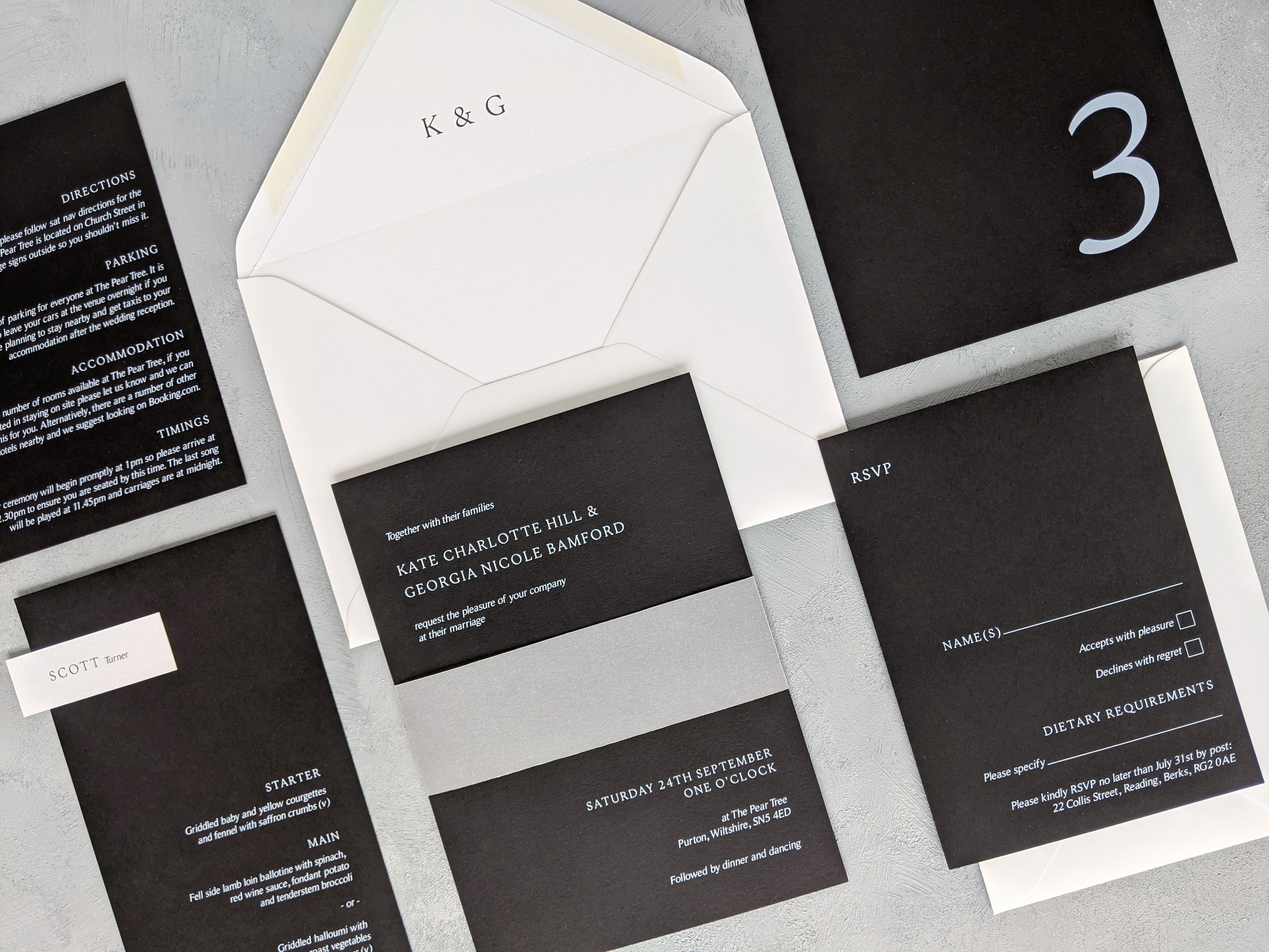 This is a really tough one as there are so many lovely stationery items that can be included within a couple’s wedding. However, if a couple were on a budget and trying to focus on key items I would suggest going with Invitations, a Table Plan, Table Numbers and Place Cards.