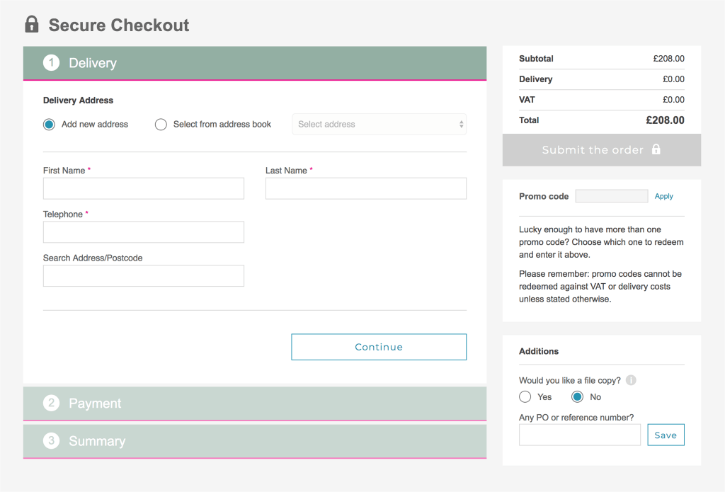 Once you’ve chosen your product, picked all of your options and uploaded your artwork, we want to make it a breeze to get everything ordered. We reduced the amount of steps to just three; ‘Delivery’, ‘Payment’ and ‘Summary’ making the whole process even simpler.